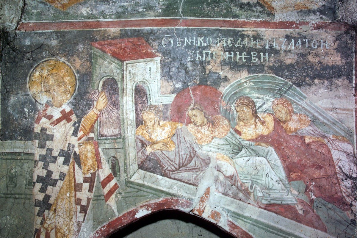 Nicholas saves the three daughters, Monastery Decani, ca. 1350 (Source)
