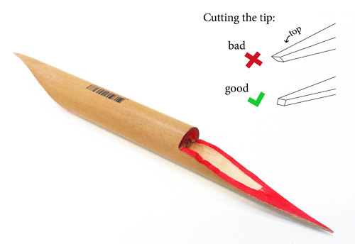 The Siniatic Codex was written with a reed pen – feather quills did not appear until about the 6th century AD.[1] The most convenient way for me to simulate the reed pen was to buy a bamboo pen, and happily this is also the cheapest calligraphy pen in existence (at less than $4.00 in my local arts supply store). Today these pens are still used by Arabic calligraphers. They work surprisingly well, especially considering that these things are essentially sticks. They are sold un-trimmed like the pen in the picture above, so you’ll need to use a very sharp knife to trim the point to get a flat edge of whatever thickness you desire. I worked out from experimentation that you shouldn’t angle your cut to give a wedge on the bottom of the point, because the ink overflows if you do. Try to cut your pen point to a clean 90 degrees or angle the cut so that it slopes on the top and not on the bottom. That should give you a nice sharp edge to write with.