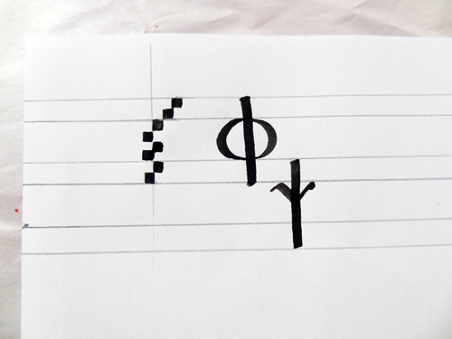 If you’ve done calligraphy before, this should sound familiar. But if you haven’t tried using a flat edged pen before, start experimenting with what it can do. You’ll find that you can’t actually write with it the way you could with a pencil or a ballpoint pen. Calligraphic letters are not written, but constructed using several strokes. Try making strokes from top to bottom and left to right, with your pen angle close to horizontal for uncial letters.