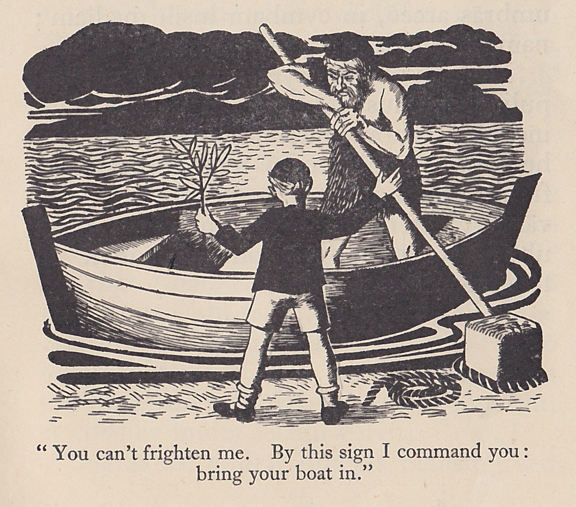 I’m very glad that the publishers chose to run with these illustrations. McCall’s drawings really make the story “pop” out at you. When you turn a page and see a new picture, you get a taste of what’s going to happen in the immediate future if you could just keep reading a little more. I particularly love the way McCall pictured the scene in which Septimus descends to the underworld à la Aeneas and orders Charon, the ferryman, to take him across the Styx.
