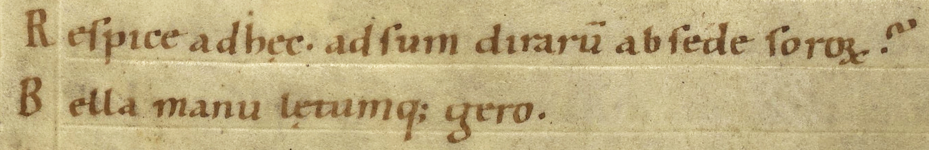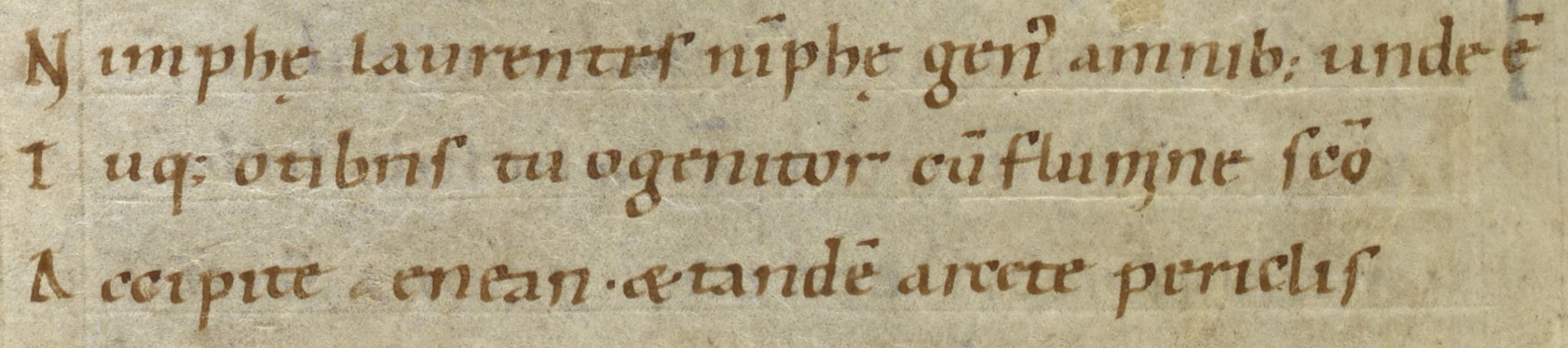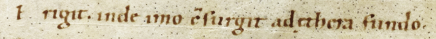 As an aside: These sample lines featured something very strange – a question mark. The same mark is used later in the manuscript (in folio 8v) to indicate a series of questions in Aeneid 8.113-4. But in this passage, there is no question being asked. So then why is it here? Perhaps the question mark had more than one job, just as the centre dot in this manuscript can stand for either a comma or a full stop (period, for my American readers). Some scholars have suggested that ? was once a marker for a raised pitch in intonation, and for that reason it came to represent a question. Whether that theory is true or not, it doesn’t seem to be appropriate in this context. “I come from the seat of the dread sisters” sounds terribly underwhelming with a rising tone. My guess – and it is only a guess – is that this mark could also function something like an exclamation point.