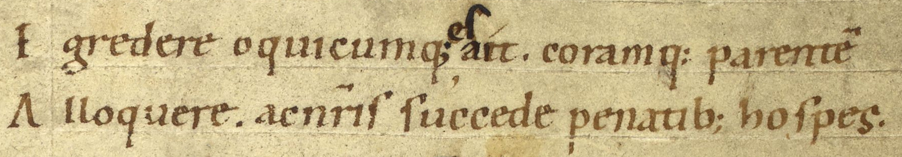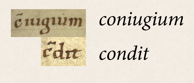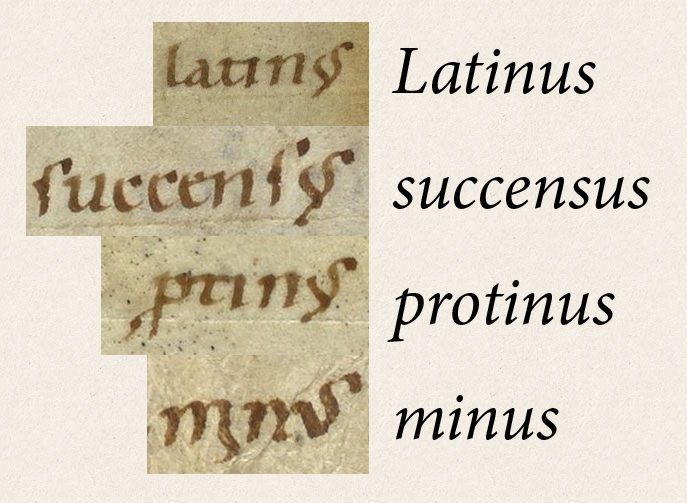 A small curly squiggle at the upper right-hand corner of a word can represent the ending “-us”. In theory, this sign can represent any vowel followed by an s, or even just an s by itself at the end of a word, but in this manuscript it seems to only represent -us.