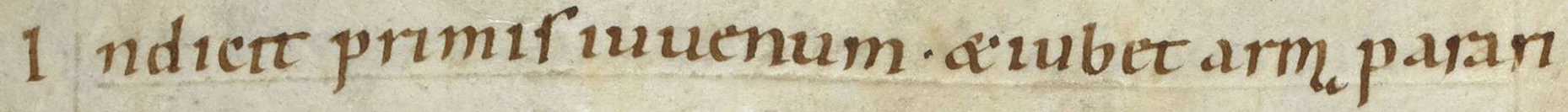Indicit primis iuvenum et iubet arma parari he appointed [sc. a journey] for the first of his young men, and ordered them to prepare arms (7.468)