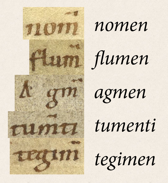 The abbreviation for -en can be considered a minor variation on the m- or n-tilde. Instead of just indicating a missing n, this tilde signifies that the letter sequence -en has been dropped. Once again, you will need to be somewhat familiar with Latin vocab. In the example below, I would remember that “nomm,” “nomn,” and “nomer” are not real Latin words, but “nomen” is, so the word must be “nomen.”