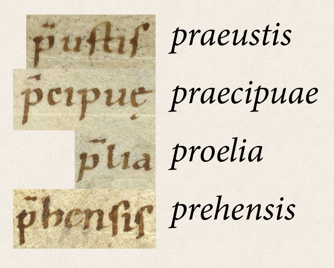 Rounding off our three p-abbreviations, the letter sequences “prae,” “proe,” and “pre” can be represented by a p with a horizontal squiggle on top. All of these sequences would have sounded the about the same in medieval pronunciation, the ae and oe diphthongs being often spelled simply as an e. So it’s natural that “prae,” “proe,” and “pre” would share the same abbreviation sign.