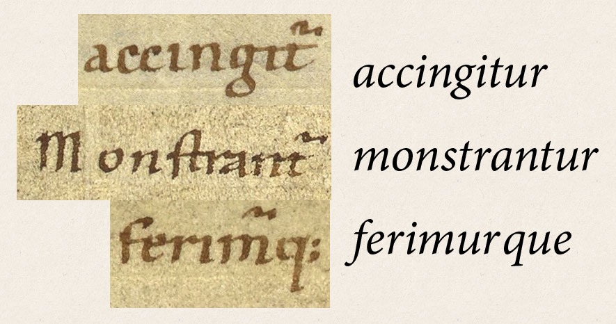 -tur, -ntur and -mur are common endings used in Latin passive verbs. The -ur part of the ending can be abbreviated to just a horizontal squiggle with a bump on top. If you look closely, and if the scribe hasn’t conflated the mark with all the other squiggly horizontal lines, this squiggle looks kind of like a flattened number 2. That’s the shape of an R without its vertical stroke.