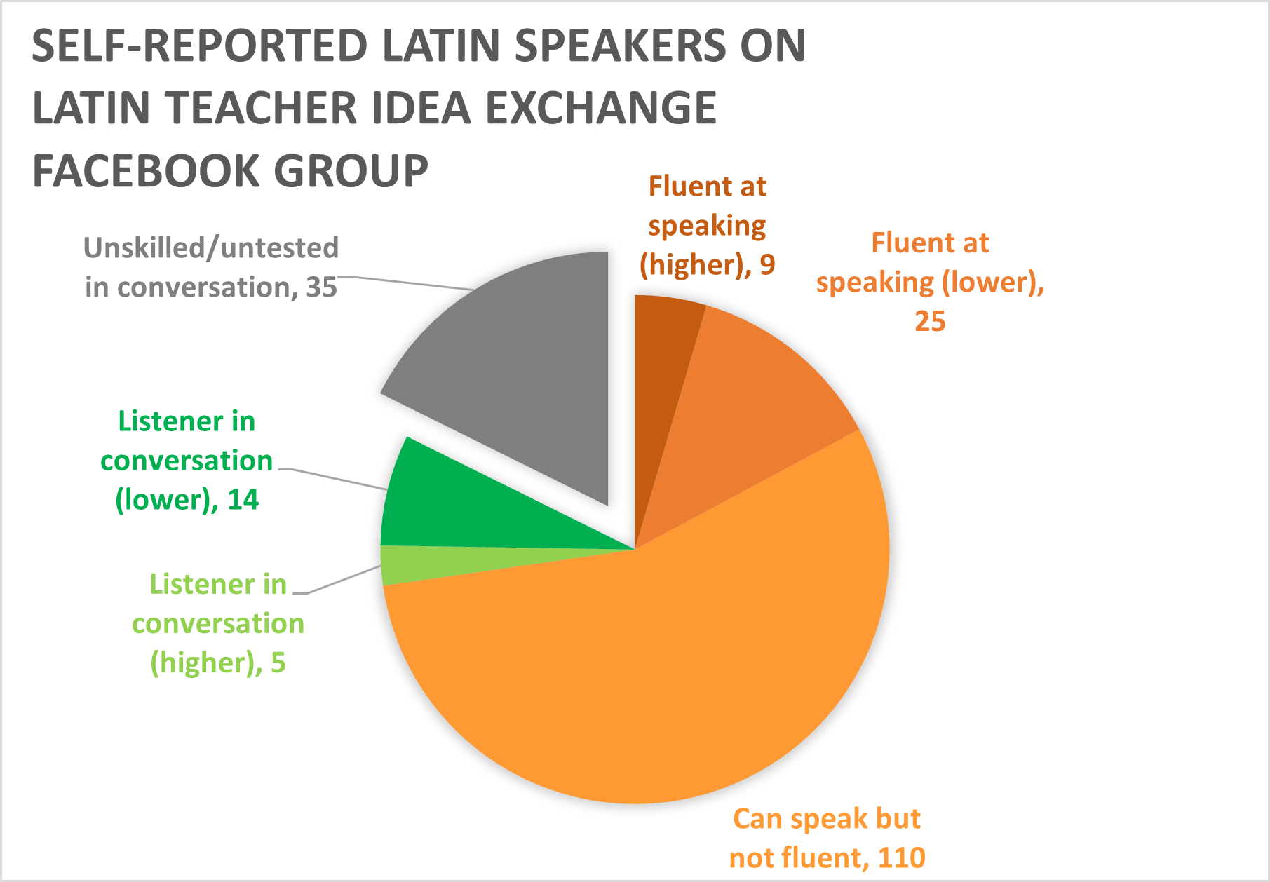 I conducted the same poll in the Latin Teacher Idea Exchange facebook group (asking members not to vote on both the reddit poll and the facebook poll) and after 2 days it had 198 respondents, of whom 144 reported they had Latin speaking experience, and 34 labelled themselves as ‘fluent speakers’. (See Fig. 3)
