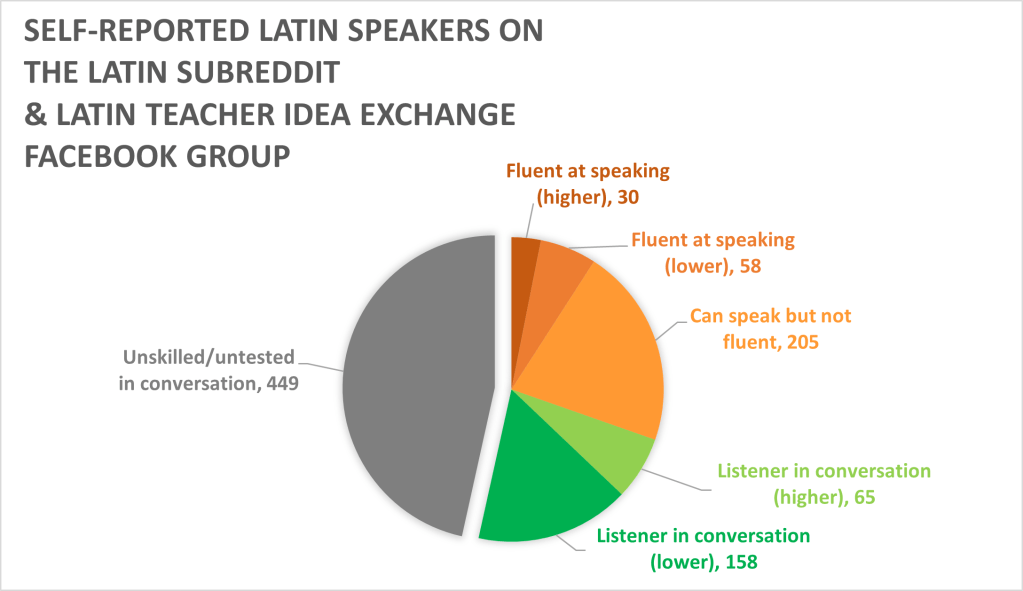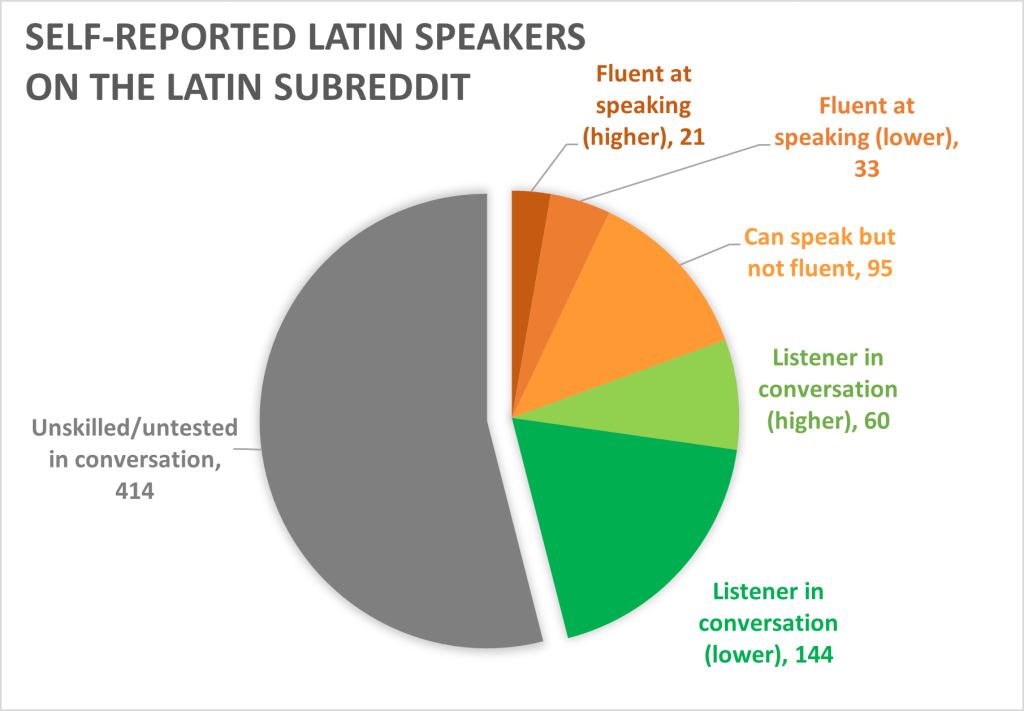 These rough polls did not reach the full breadth of Latin speaking communities – both were conducted in English in mostly-Anglophone Latin groups, whereas there is a very significant if not larger population of Latin speakers in non-Anglophone Europe. Nevertheless, assuming there were no duplicate answers between the polls, at least 293 English-speaking Latinists have reported that they have used Latin in spoken communication. It seems reasonable to suggest that there are at least a few hundred Latinists with speaking experience, and perhaps double this number would be found if one were to poll non-English Latin speakers too.